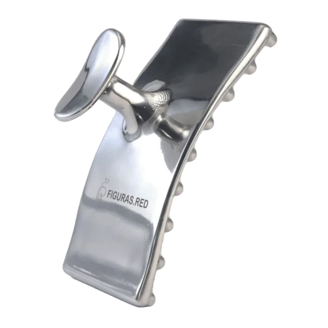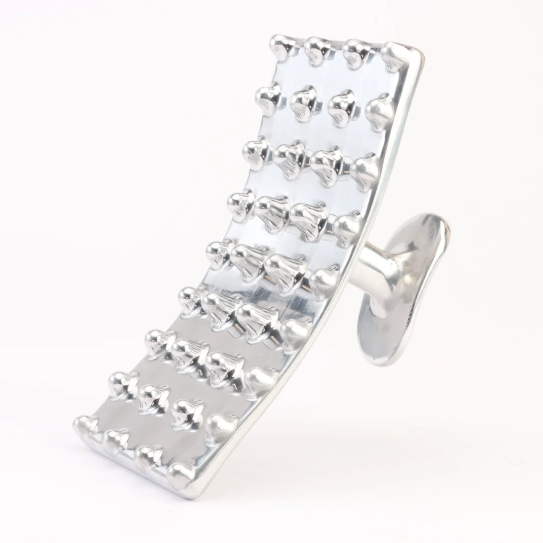 La base rectangular levemente curva presenta una aleta de enganche entre el dedo índice y medio que permite que la mano esté en perfecta posición ergonómica. El terapeuta puede generar las maniobras sobre el tejido sin fuerza ni presión. Este accesorio no genera dolor en paciente ni desgaste al terapeuta.
